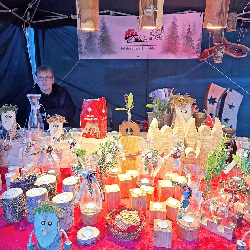 Der Markt war wirklich schön und bot eine große Vielfalt, jedoch spielte das Wetter nicht mit. Trotz des anhaltenden Regens waren viele interessierte Besucher vor Ort. Neben unseren Schwarzwaldmännchen zogen vor allem unsere Lampen und die Zwetschgen-Holz-Biergarnitur die Blicke auf sich und waren die Highlights an unserem Stand.