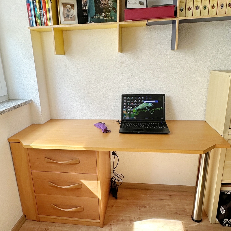 Ein über viele Jahre geschätzter Wohnzimmerschrank als Erinnerungsstück war für die neue Wohnung zu groß, sodass er nicht mitgenommen werden konnten. Daher haben wir Teile des Schrankes umgestaltet und einen maßgeschneiderten Schreibtisch geschaffen, der perfekt in das neue Arbeitszimmer passt. Die Form der Schreibtischplatte erinnert an die Konturen des Wohnzimmerschrankes, sodass ein Stück Geschichte in die neue Wohnung einzieht. Mit integrierten Strom- und USB-Anschlüssen erfüllt der Schreibtisch zudem moderne Anforderungen.