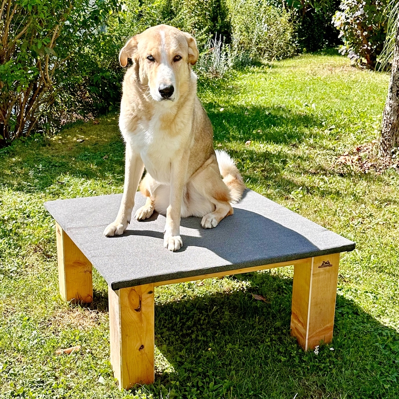 Deshalb haben wir ein kleines, wetterfestes Podest für den Garten entworfen, das sich ideal für das Training zu Hause eignet. Bei uns hat es wunderbar funktioniert, und deshalb bieten wir diese Podeste jetzt auch anderen Hundebesitzern und Hundeplätzen an.